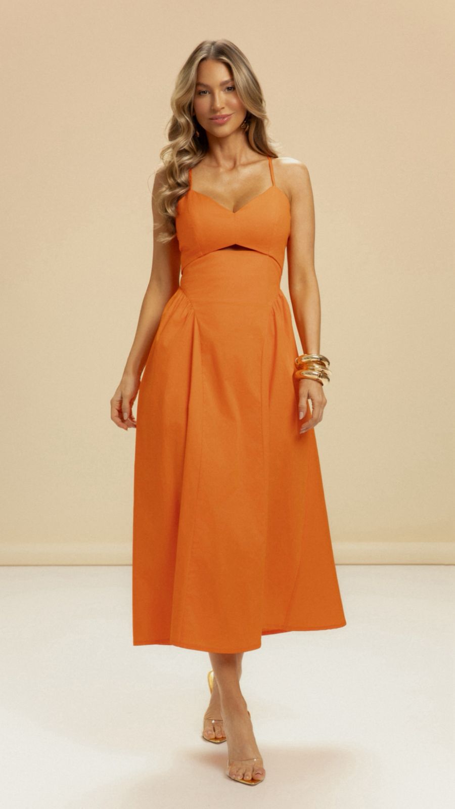 O VESTIDO MIDI ROSE DE ALCAS FINAS COM REGULAGEM , POSSUI RECORTES ASSIMETRICOS ABAIXO DO BUSTO E DETALHE FRANZIDO NA CINTURA. FECHAMENTO EM ZÍPER E LASTEX NAS COSTAS.